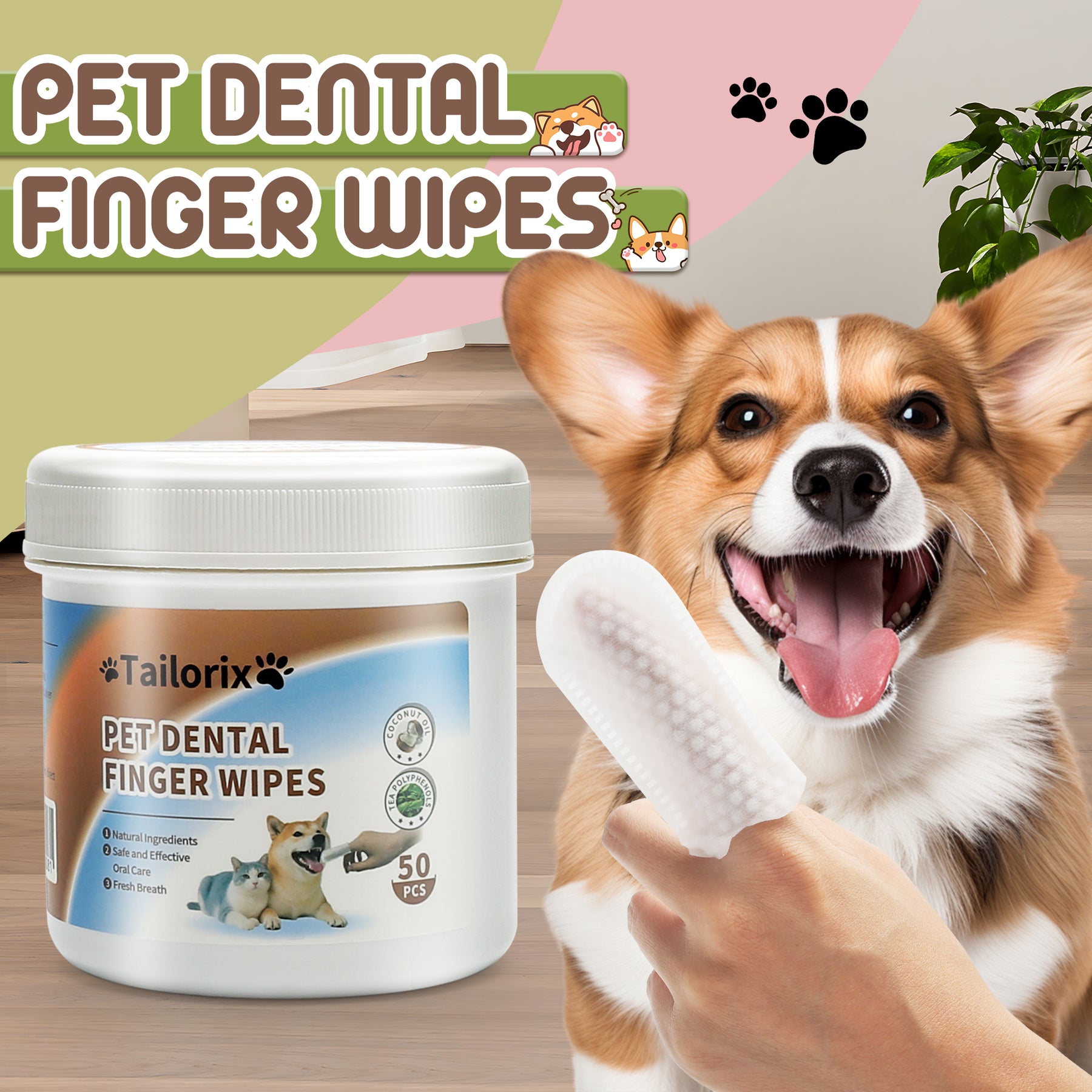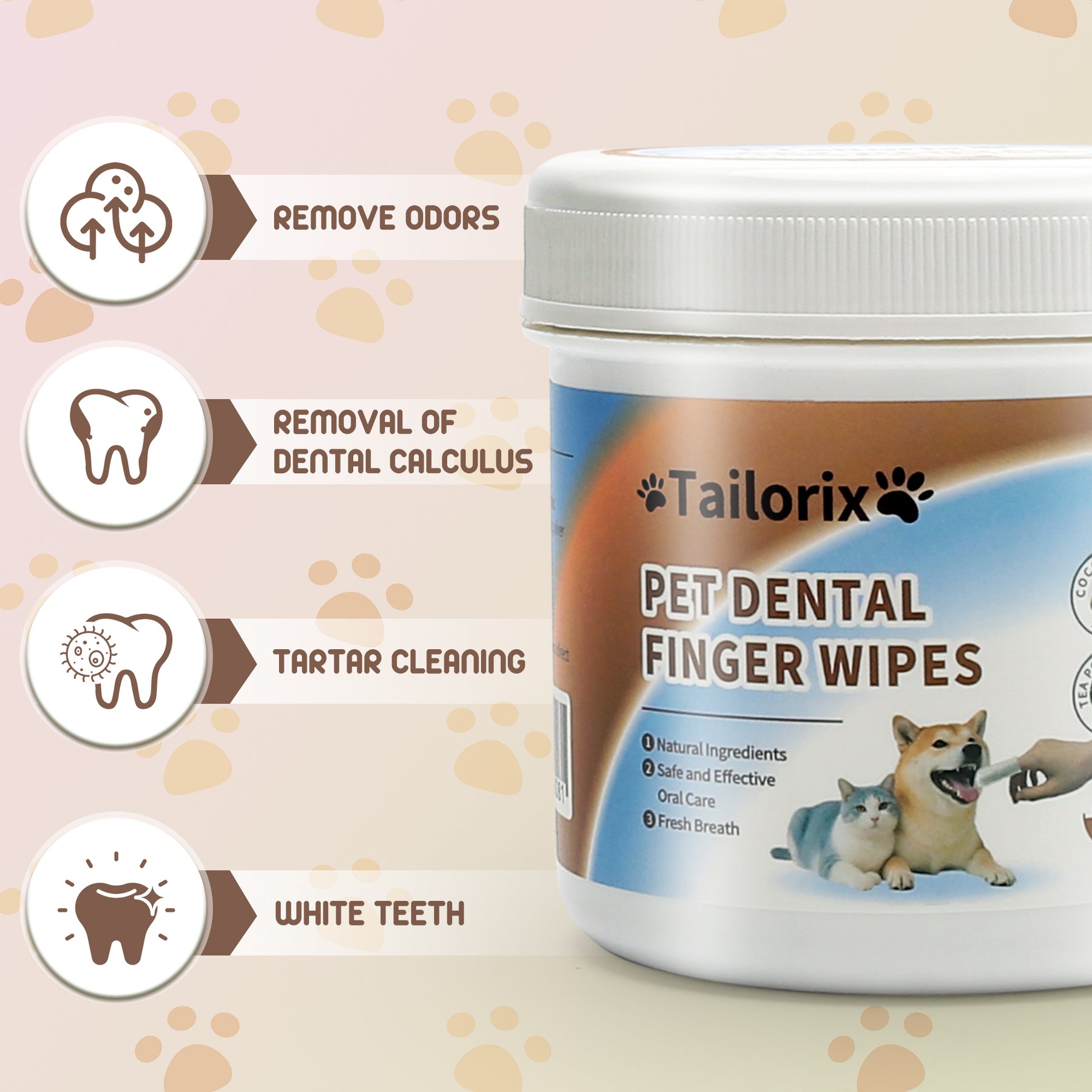 Tailorix Pet Teeth Cleaning Finger Wipes - Dog & Cat Dental Care Kit, Fight Bad Breath/Plaque/Tartar, Remove Stains & Nourish Gums, Vet-Approved for Small Animals